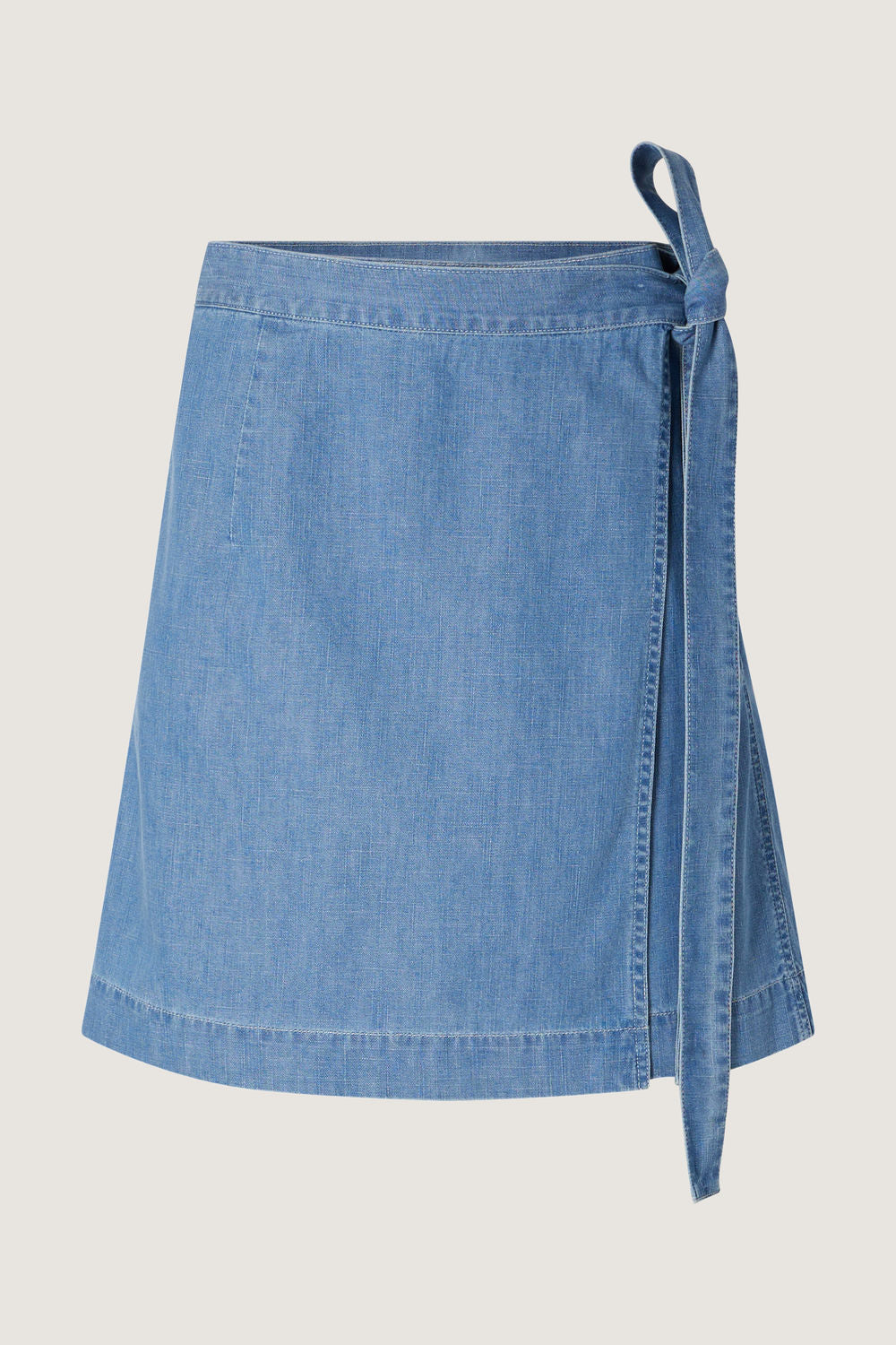 aime skirt Short light blue cotton wrap skirt with topstitched details