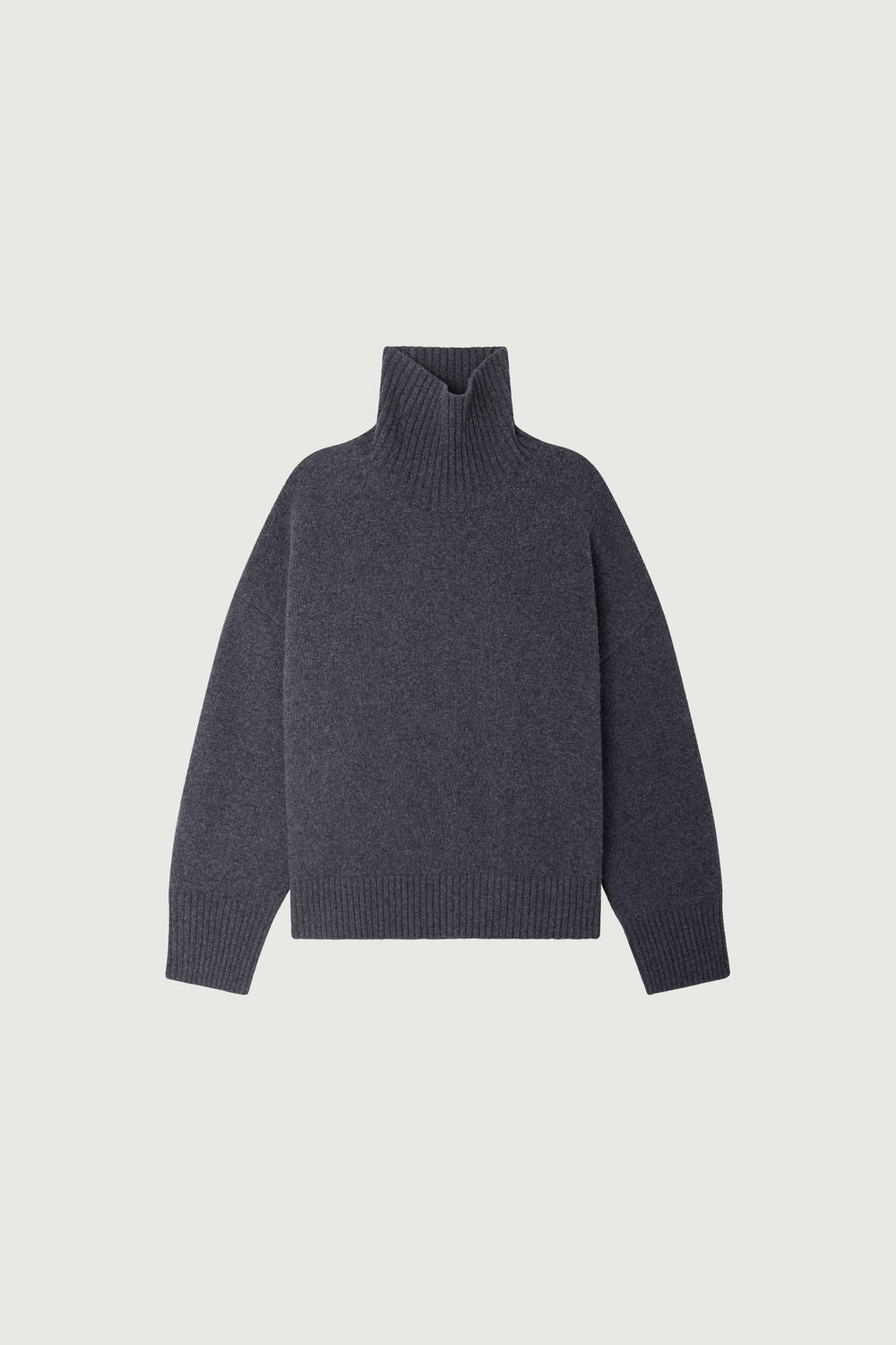 WILLIAM is a turtleneck jumper with long sleeves, knitted in merino wool yarn. It has a straight, oversized cut, and the sleeves are intentionally long to cover the base of the hand. Extra long and cocooning, it can be worn all winter over a pencil skirt or wide trousers.